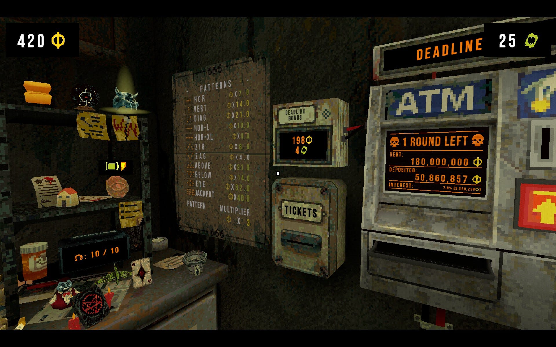 Πέραν των χρημάτων, θα αποκομίσετε κουπόνια τα οποία με τη σειρά τους θα σας δώσουν πρόσβαση σε φυλαχτά με διάφορες χρήσεις — αυξημένους πολλαπλασιαστές, βελτιωμένες πιθανότητες εμφάνισης συμβόλων, προστασία από τον καταστροφικό συνδυασμό 666 κλπ. Το ATM με τη σειρά του θα σας δίνει έπειτα από κάθε γύρο τόκο για το ποσό που έχετε καταθέσει. Στο τέλος κάθε deadline, θα έχετε την ευκαιρία να επιλέξετε παθητικές ικανότητες μέσα από το τηλέφωνο.