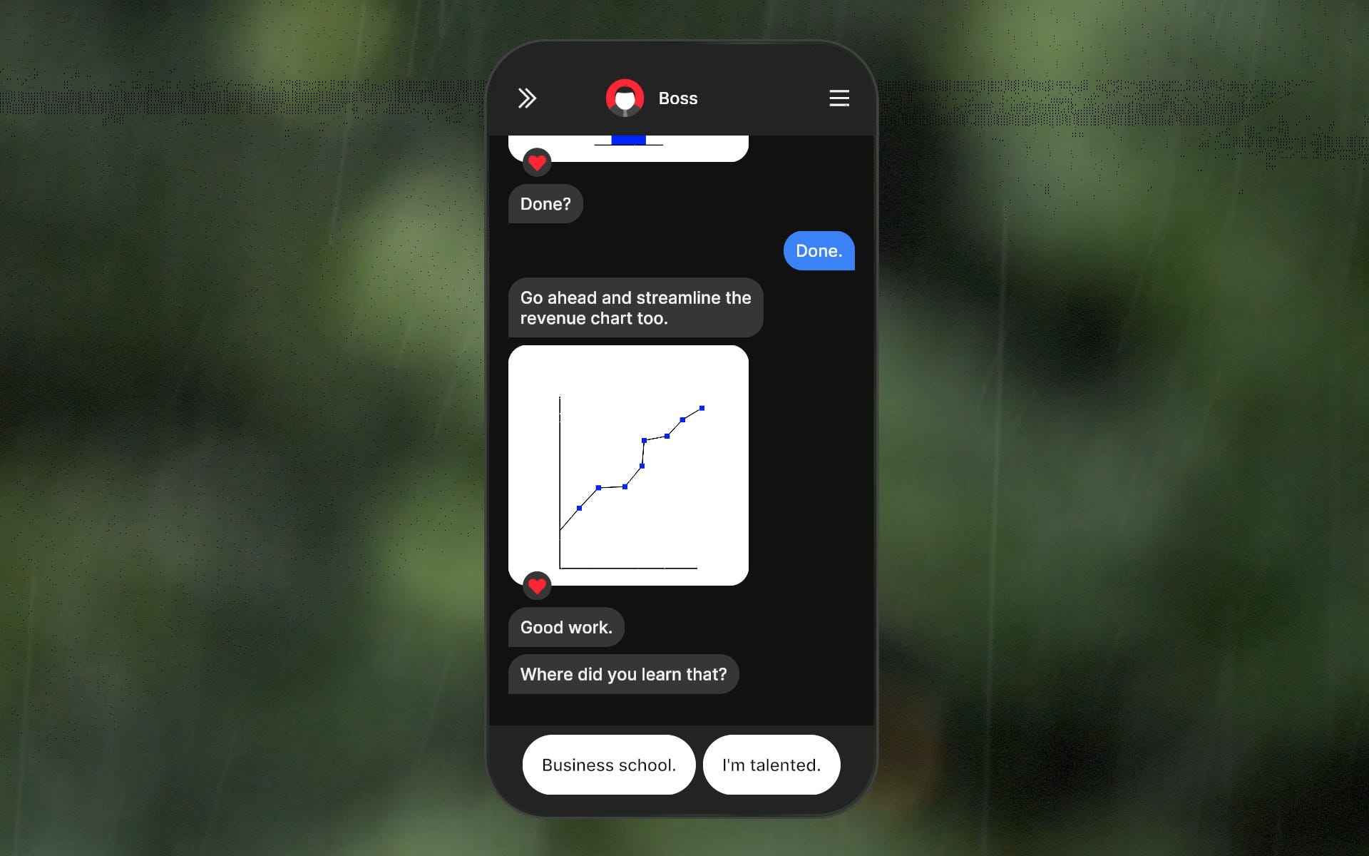 Στο Pocket Boss αναλαμβάνετε τον ρόλο ενός υπαλλήλου σε μία μεγάλη εταιρεία αγνώστων λοιπών στοιχείων, με το αφεντικό σας να σας ταράζει στα μηνύματα 24/7, στέλνοντάς σας τις πλέον παράλογες διορθώσεις. Η δουλειά σας; Να «βελτιώσετε» τα πάντα: από την ικανοποίηση των συναδέλφων σας μέχρι τα μερίδια αγοράς των ανταγωνιστών σας. Όχι μέσω ουσιαστικών ενεργειών φυσικά, αλλά απλώς… πειράζοντας γραφήματα!